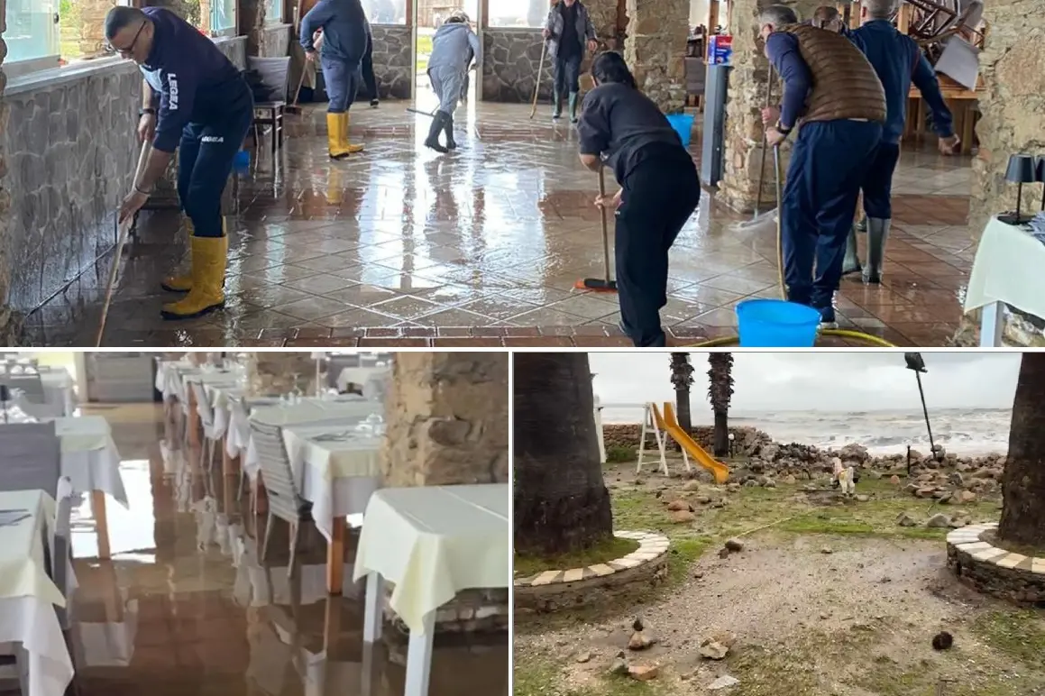 An der Küste von Capoterra laufen Aufräumarbeiten: Angesichts der anhaltenden Sturmflut besteht die Befürchtung, dass steigende Wasserstände Häuser bedrohen könnten.