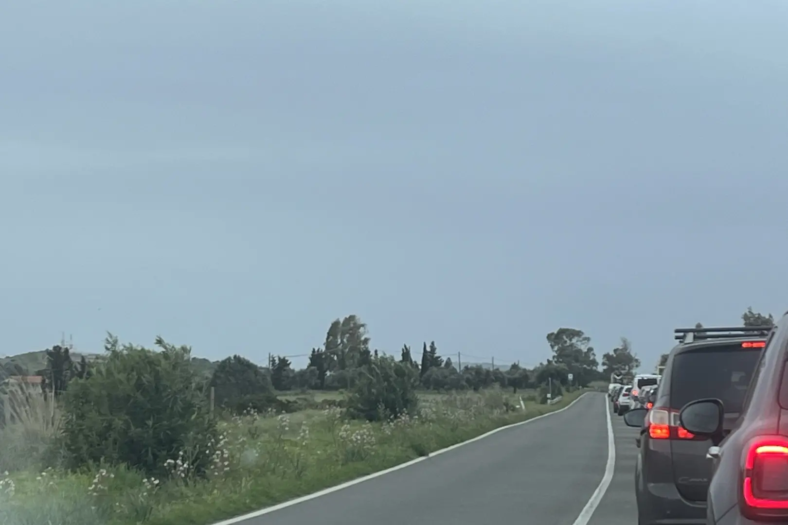 Entlang der Staatsstraße 387, die die Staatsstraße 554 mit Dolianova und Serdiana verbindet, erstreckte sich ein fünf Kilometer langer Autostau. Damit mussten sich Autofahrer heute Morgen auseinandersetzen – und müssen es immer noch. Wer plötzlich vor dem Stau stand, hielt ihn zunächst für einen Unfall, wie so oft.