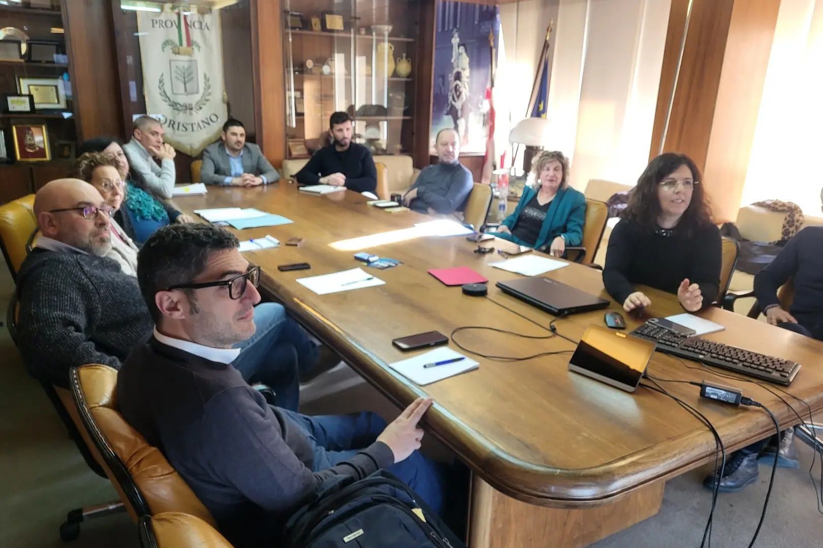 Am Tisch saßen der Provinzpräsident Paolo Pireddu , der Umweltdezernent Andrea Grussu , der Leiter des Umweltsektors Raffaele Melette , die Biologinnen Maddalena Irranca und Cristiana Colombino sowie die Beamten Stefano Cadoni und Manuela Urracci . Ebenfalls anwesend waren die Leiterin des örtlichen Gesundheitsamtes Grazia Cattina , die Leiterin der Arbeitsschutzbehörde Sisp Maria Valentina Marras , der Entomologe Claudio Venturelli , Cipriano Foxi vom Institut für Zooprophylaxe und Luigi Attianese von der Firma Nuova Prima.