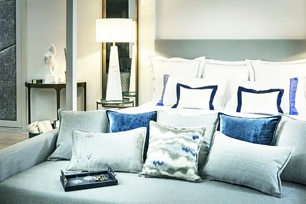 La palette di colori neutri i grigi mélange dei cuscini decorativi sul sofà-letto, i bianchi candidi e gli accenti blu – creano un ambiente che invita alla distensione. Ogni cuscino, dal più strutturato in tessuto bouclé al più morbido con i motivi astratti nei toni del blu e del grigio, è un elemento che contribuisce all'estetica generale, dimostrando una cura maniacale nella selezione dei materiali e nelle finiture. I profili a contrasto dei cuscini da letto, un segno distintivo di eleganza sartoriale, sottolineano la ricerca di Cloto per un design raffinato e intramontabile.