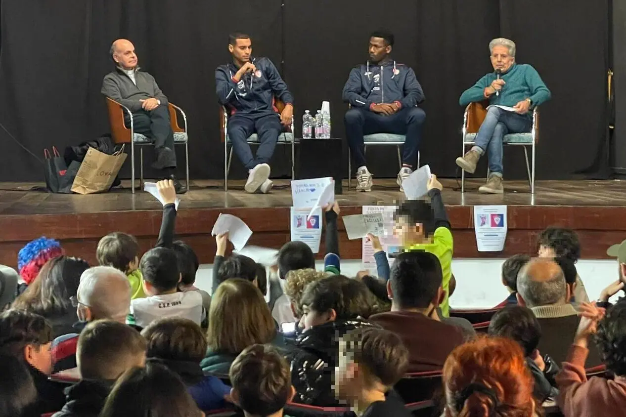 La parte più sana del tifo trasportata a teatro, con dei tifosi d’eccezione: bambini e ragazzi del quartiere Marina, che hanno accolto con tantissimo affetto i calciatori del Cagliari Riyad Idrissi e Yael Trepy. L’occasione è l’evento di apertura della festa di Sant’Eulalia, un incontro che ha messo i giovani a confronto con due protagonisti di questo inizio di 2026 rossoblù, dal titolo “I valori dello sport: scuola di amicizia e rispetto che educa alla giustizia e alla pace”.