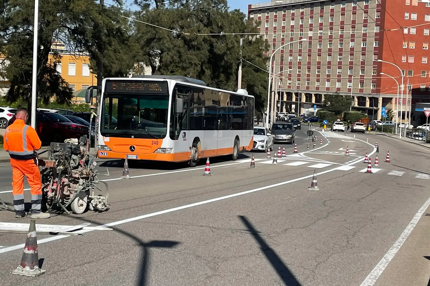 A mezzogiorno di ieri prima corsa col passaggio nelle due fermate “Is Mirrionis fronte Cus Cagliari”, le numero 2169 e 2170. In contemporanea, gli operai disegnavano la nuova segnaletica orizzontale.