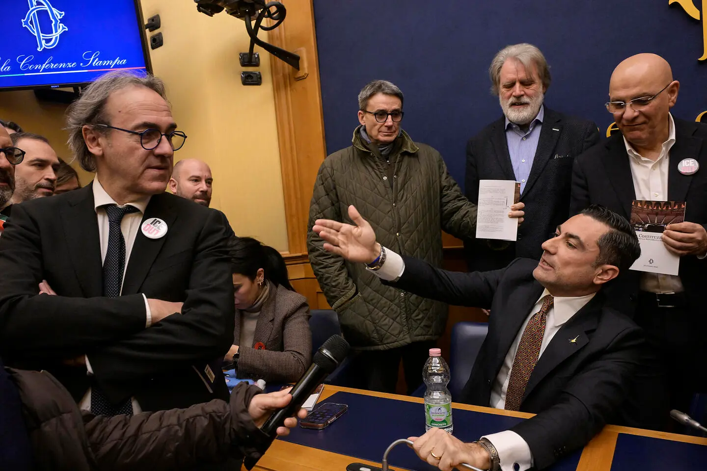Il capogruppo M5S Riccardo Ricciardi gli ha rinfacciato il gesto della “Decima” fatto in Aula: «Vergogna». Il deputato Pd Gianni Cuperlo ha cominciato a leggere la Costituzione. Angelo Bonelli di Avs ha alzato la voce: «Portare qua naziskin e neofascisti è un oltraggio». Poi qualcuno ha intonato Bella Ciao. Ed è cominciato il primo coro. Il deputato Pd Nico Stumpo si è inventato una filodiffusione fai da te: ha avvicinato il cellulare al microfono e fatto risuonare il canto partigiano “Fischia il vento”.