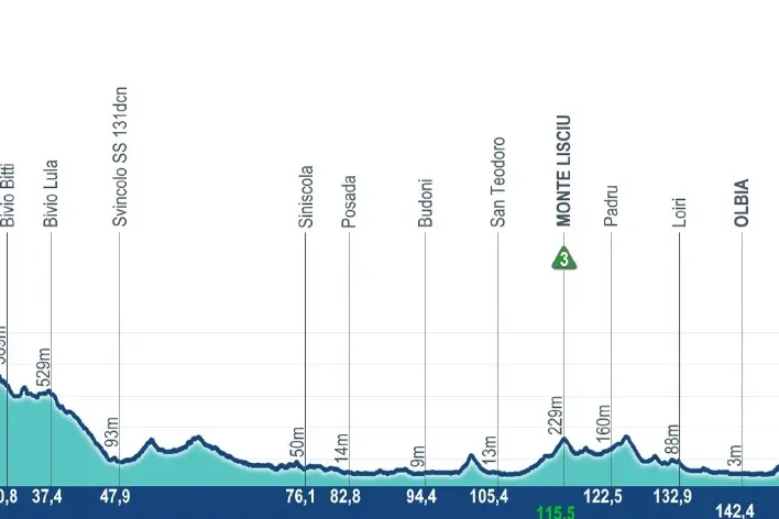 La quinta tappa Nuoro-Olbia, di 183,6 km è la più facile e non dovrebbe modificare la classifica. Possibile una volata in via Isola Bianca. Subito il gpm di Su Pradu, poi si scende. Partenza alle 10.45 da piazza Italia, diretta tv (RaiSport-Eurosport) dalle 13.40.