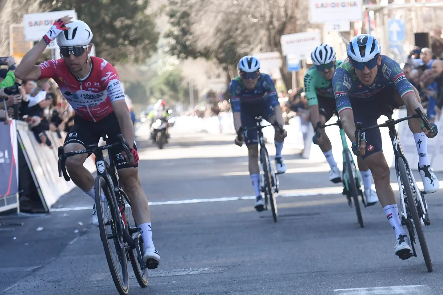 Bosa. Viene dal mare il primo titolare della maglia azzurro-mare di leader del Giro della Sardegna. Nicolò Garibbo, 26 anni, di Imperia, coglie l’attimo a due passi dal Temo e si prende tappa e comando della classifica, risolvendo negli ultimi metri una battaglia di tattica e nervi cominciata, di fatto, sulla rampe in salita verso Villanova Monteleone. In una corsa tornata con un profilo basso (categoria 2.1), con tanti giovani in cerca della giornata giusta per vincere alla lotteria e tante squadre Continental, è lui il primo nome da mettere sul taccuino. C’è anche un’altra notizia però, sotto un sole mai tanto atteso e gradito nell’Isola: i favoriti non si sono nascosti ma hanno messo il naso alla finestra e alla fine sono tutti nelle posizioni di testa.