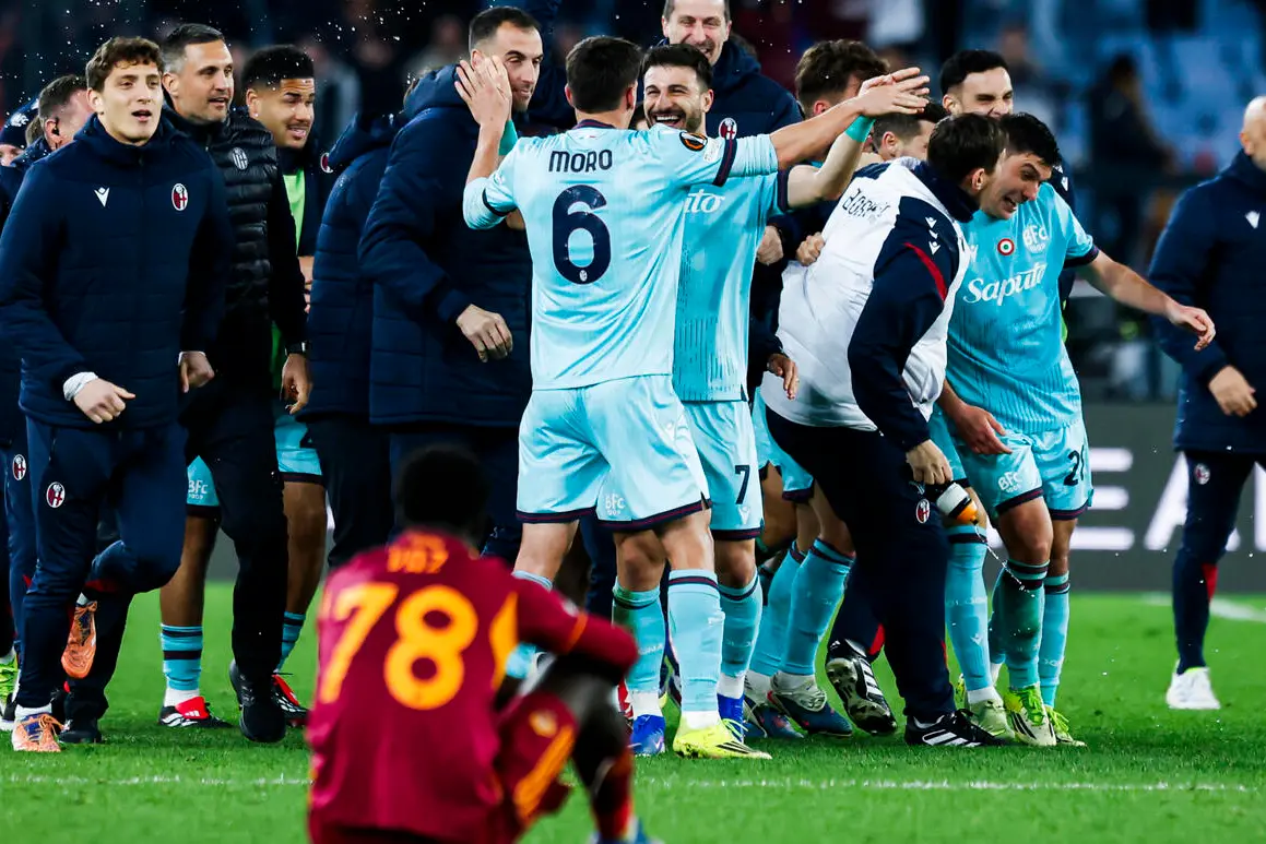 Tanti gol, emozioni, spettacolo e bandiere al vento. Finisce con la festa del Bologna in un Olimpico elettrizzante fin dal via e il buio pesto che avvolge la Roma di Gasperini che capitola 4-3. A i quarti di finale, ad affrontare l'Aston Villa, ci vanno gli uomini di Italiano, al termine di una lotta durata 120 minuti con i supplementari a seguito del 3-3 dei primi 90': a decidere la sfida all'overtime è il gol di Cambiaghi. Il tutto dopo un bel primo tempo con i rossublù avanti grazie all'eurogol di Rowe ripresi dalla testata di Ndicka e poi di nuovo in vantaggio su rigore siglato da Bernardeschi. Ripresa ancor più avvincente con la squadra di Italiano avanti di due gol grazie alla rete di Castro che approfitta di uno svarione della difesa romanista e che poi si fa rimontare da Malen (su penalty procurato da Robinio Vaz) e Pellegrini.