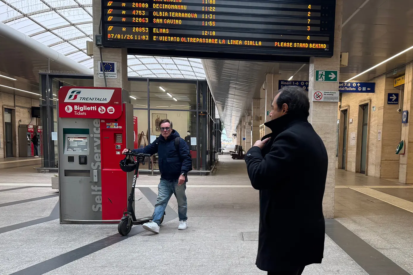 Nessun negozio, che aiuterebbe a ingannare l’attesa restituendo alla città la sua vocazione turistica e magari aiuterebbe a dimenticare anche per poco la lentezza dei treni sardi. Qualche sala d’attesa, i servizi igienici a pagamento: un euro, avverte il cartello appeso sopra la testa dell’uomo alla scrivania. In compenso il wi-fi funziona, è facile accedere alla rete ed è veloce.
