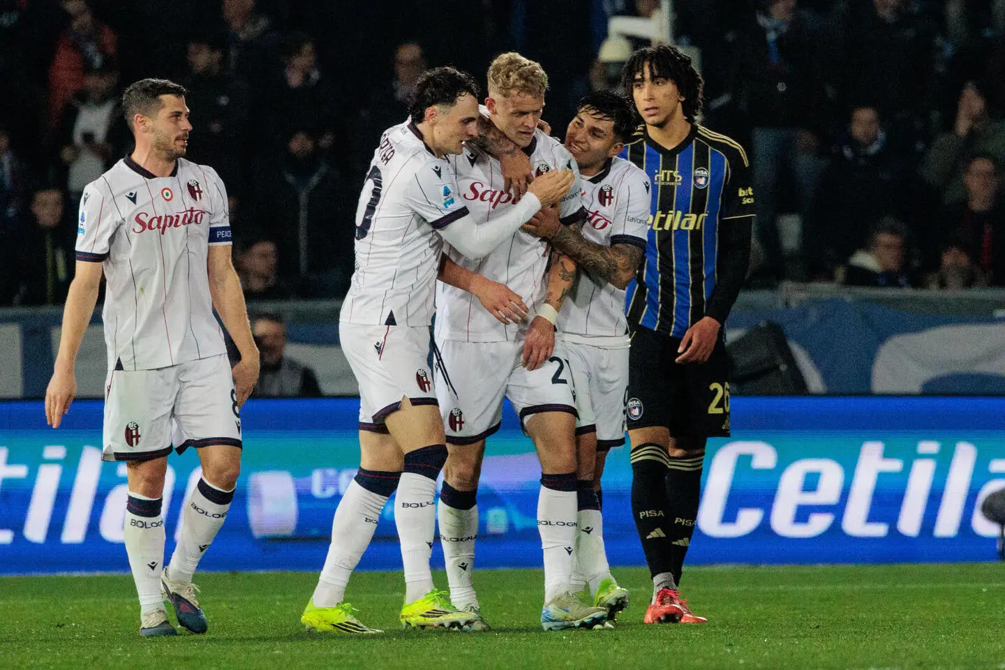 Pisa. Alla fine la vince Odgaard, ma il Bologna ringraziare soprattutto Skorupski e Zortea se è riuscito a battere il Pisa allo scadere. I toscani, infatti, avrebbero meritato molto di più. È il Bologna però a prendersi il bottino al termine di un match che ha giocato maluccio e che in più di una circostanza ha rischiato di perdere, un monumento per Zortea che ha tolto un pallone dalla porta su colpo di testa di Stoijlkovic. Il Bologna riesce solo a difendersi, i padroni di casa ci credono. Italiano prova a rimescolare le carte con l'ingresso di Orsolini e Odgaard e proprio il danese estrae dal cilindro il colpo da tre punti: il suo sinistro micidiale dai 20 metri al 90' si insacca all'incrocio dei pali. Cala il sipario con la quinta vittoria consecutiva del Bologna tra campionato e Europa League.