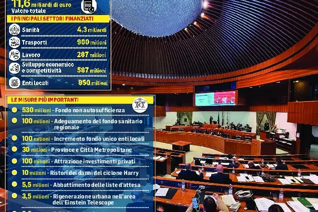Tra gli interventi più importanti, i dieci milioni per far fronte ai danni del ciclone Harry. Ugualmente significativi i cento milioni in più per tre anni per il fondo unico degli enti locali che passerà da 570 a 670 milioni. Arrivano anche i cinque milioni per l’attuazione del patto di Buggerru sulla sicurezza nei luoghi di lavoro. E poi 30 milioni per Province e Città Metropolitane, 3,5 per la rigenerazione urbana nell’area del progetto Einstein Telescope, 5,6 per l’edilizia scolastica, 5,5 per abbattere le liste d’attesa, 6 per manutenzione di reti idriche. Ragionando per settori, alla sanità va quasi la metà del bilancio (4,3 miliardi), 900 milioni sono per i trasporti, 287 per il lavoro, 587 per sviluppo economico e competitività, 850 per gli Enti locali, 239 milioni per il diritto allo studio, 530 per il fondo non autosufficienza, 100 milioni per adeguare il fondo sanitario regionale al nazionale, altri 100 per attrarre investimenti privati. «I punti qualificanti della manovra sono rappresentati dalla conferma di ciò che avevamo stabilito sull’istruzione, l’università e l’aiuto al sociale», ha spiegato Giuseppe Meloni, «era importante evitare il secondo mese di esercizio provvisorio per permettere al bilancio della Regione di essere operativo: non si va più in dodicesimi e si sbloccano i pagamenti, tutto può funzionare al meglio e ora ci apprestiamo ad affrontare la variazione di bilancio triennale che poi è il cuore pulsante delle manovre finanziarie della legislatura».