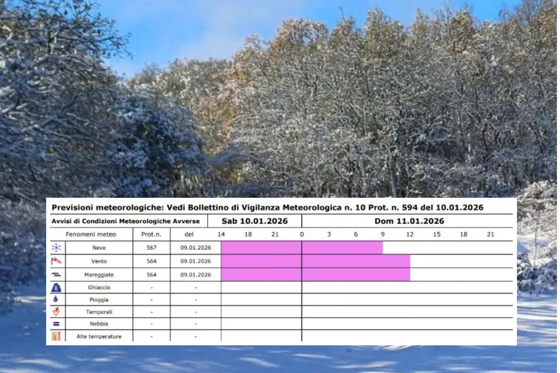 La Protezione Civile regionale ha emesso un nuovo avviso di condizioni meteo avverse per neve, fino alle 23,59 di domani domenica 11 gennaio, che interesserà i rilievi oltre gli 800 metri.